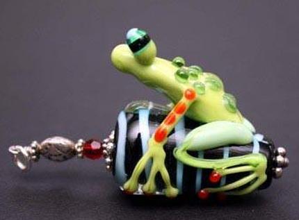 Бланш: После того, как Гай начал делать бусы летом 2003 года, он продолжал пробовать новые техники из руководства по изготовлению бисера Корины Теттингер. Многие рисунки он усвоил быстро или, по крайней мере, после многих попыток, но бусины-лягушки какое-то время ускользали от него. Когда он стал лучше делать их, люди стали покупать их больше, поэтому он не отставал от спроса. Ему нравится задача заставить их сидеть прямо на бусине, правильно расположив пальцы ног, пальцы и ноги. Он также хотел добавить, что попытка не обжечься, кладя стакан, и достижение точного вида также поддерживает развитие его искусства.