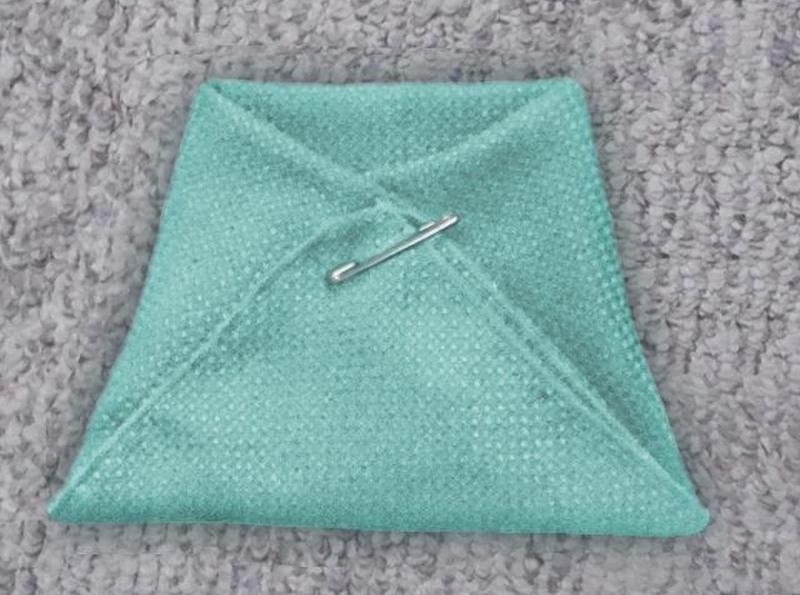3. Поверните сложенную салфетку так, чтобы треугольная точка оказалась внизу к вам. Поднимите нижнюю часть салфетки по сторонам, которые вы сложили на предыдущем шаге. Используйте большую английскую булавку, чтобы все было надежно. При желании добавьте небольшой бант из ленты, чтобы обеспечить дополнительное украшение.
