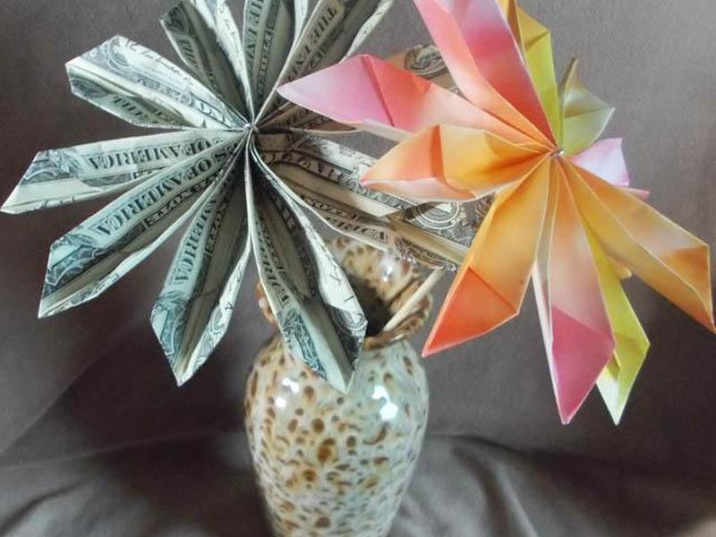 Цветочная композиция оригами, сделанная из денег, станет прекрасной идеей подарка на день рождения, выпускной или другой особый случай. Цветы из денег тоже не сложно сложить. Большинство из них основаны на модульных конструкциях оригами, которые создают готовый цветок, когда вы соединяете несколько одинаково сложенных блоков. В этом уроке вы узнаете, как сделать цветок из пяти купюр. Его можно подарить как единственный подарок или поместить в композицию из цветов, в которую входят традиционные цветы оригами или другие цветы оригами из денег.