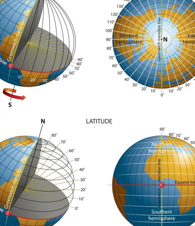 - Долгота идет от полюса к полюсу. Линии долготы окружают земной шар в направлении север-юг. Нулевой градус долготы проходит через Королевскую обсерваторию в Гринвиче, Англия.