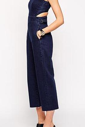 - В Wide Leg Cut Out Джинсовый комбинезон показывает неожиданный проблеск кожи через боков и нижней части спины. Насыщенный оттенок индиго и укороченная длина делают этот стиль одним из самых шикарных. Еще лучше, его можно стирать в машине. Это 100-процентный хлопок, округлый вырез горловины и боковые карманы. Ожидайте платить чуть менее 100 долларов.