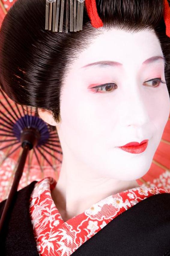 Совершенно белое лицо, отличительная черта макияжа гейши, постоянно носит только майко , или гейша-ученица.