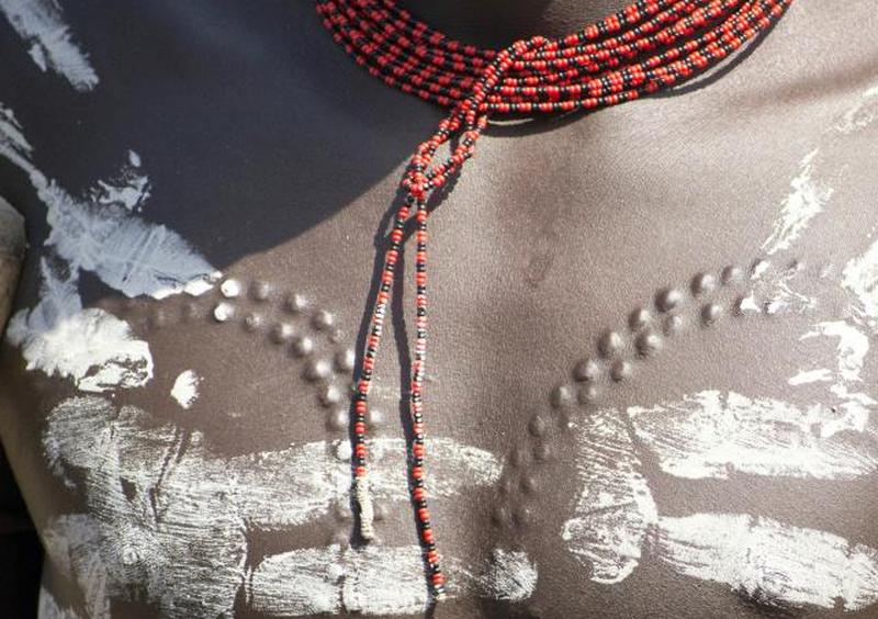 Самым ранним свидетельством скарификации являются археологические раскопки в Айн-Газале в Иордании, где были найдены две безголовые фигурки палеолитических (8000 г. до н.э. ) статуй богини плодородия с толстыми линиями скарификации, изгибающимися вокруг ягодиц и живота. Наскальная живопись Сахары (ок. 7000 г. до н.э. ) в Тассили-Н’Аджер в Танзумайтеке, Алжир, также изображает шрамы на груди, животе, бедрах, плечах и икрах Рогатой Богини. Подобные рисунки шрамов, изображенные на фигурках и картинах, были обнаружены у женщин из Западной и Центральной Африки.