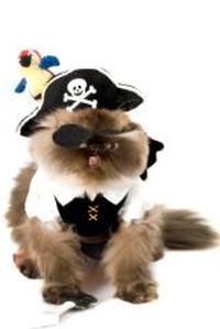 Костюмов кошек в целом меньше, чем костюмов собак, и их труднее найти. В крайнем случае, вы можете обойтись костюмом для маленьких собак. На сайте Spoiled Rotten Kitties, ориентированном на кошек, есть костюмы и даже изображение костюма пиратской кошки, но, похоже, на нем больше нет этого. У них есть костюм для пиратской собаки, и они говорят, что маленький должен подойти. Это просто шарф в красно-белую полоску с головным убором в виде черепа и скрещенных костей. Конец головного убора свисает возле лица, так что вам, возможно, придется быть готовым к тому, что вам придется много бить ватином.
