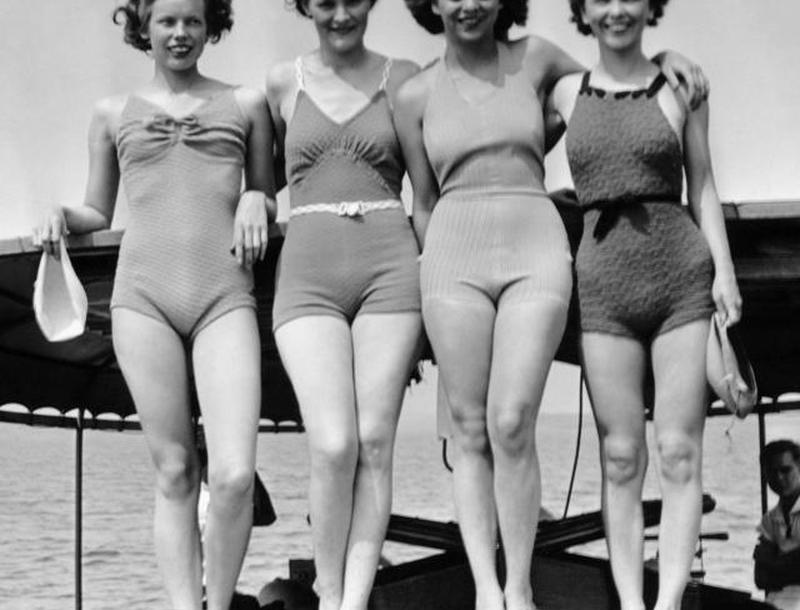 Когда примерно в 1930 году в моду вернулись женственные изгибы, производители начали находить способы формировать тело в костюме, используя вытачки, швы и стратегически расположенную резинку, чтобы приподнять и подчеркнуть бюст. Однако самым важным нововведением был Lastex, эластичная пряжа, состоящая из экструдированного каучукового сердечника, покрытого хлопком, вискозой, шелком, ацетатом или шерстью, которая была представлена в 1931 году и вскоре произвела революцию в отрасли. Его можно было использовать как в трикотажных, так и в тканых тканях, он давал улучшенную посадку и контроль над фигурой, а также позволял дизайнерам добавлять поддерживающие слои, такие как бюстгальтеры и панели для управления животом, без увеличения объема силуэта. Ткани на основе латекса, некоторые из которых также содержат новую синтетическую пряжу, вскоре стали доступны с различными текстурами и обработкой поверхности, включая эластичный атлас, бархат, гофрированный хлопок, и новинки трикотажа. Полностью резиновые костюмы, сделанные из тисненого резинового листа, были представлены в 1932 году и были недорогим вариантом на протяжении всего десятилетия, хотя они легко рвались, а иногда и отслаивались от тела во время сильного прибоя. Резина нашла более практическое применение в купальных шапочках, которые теперь плотно прилегали к голове, чтобы волосы оставались сухими, и в купальных туфлях, многие из которых представляли собой формованные резиновые копии уличной обуви.