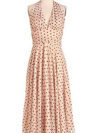 - Платье ModCloth Amour Than Anything. Это бледно-розовое платье с широкими бретельками и черным принтом в горошек напоминает ретро. На груди и на толстой ленте вокруг талии лестные рюши, а длина платья достаточно велика, чтобы полностью закрыть ноги, и при этом выглядеть красиво, когда вы крутитесь. Это платье доступно в размерах от 4 до 24, но, по словам рецензентов, оно немного большемерит. Он продается по цене около 130 долларов.