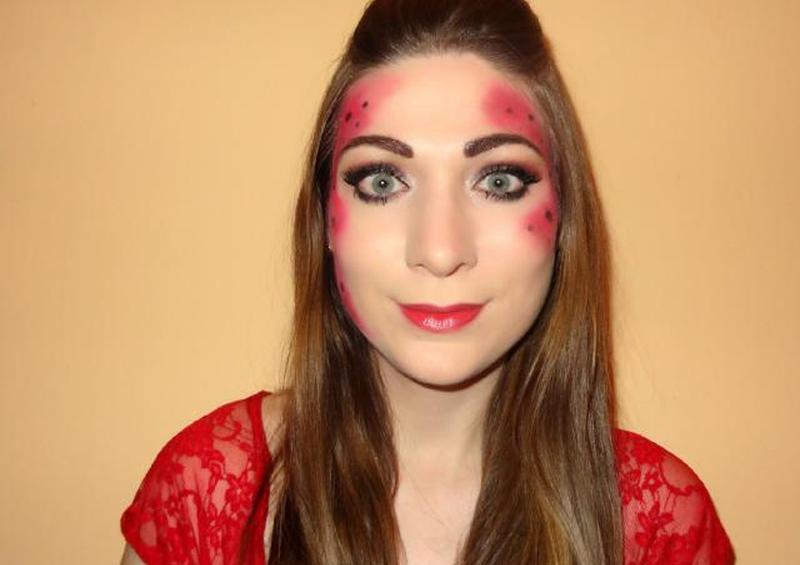 - Пропустите детали лица: один из вариантов — пропустить красные и черные детали лица и придерживаться гламурного глаза и красной губы. Просто не забудьте надеть красный наряд или добавить пару сережек в виде божьей коровки.