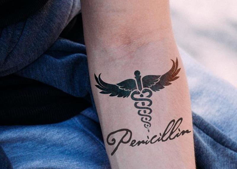 Обычная татуировка с медицинским предупреждением — это те, которые предупреждают об аллергии на лекарства, такие как пенициллин, или продукты, такие как арахисовое масло, как показано выше. Если у вас аллергия, она может привести к анафилактическому шоку, если вы проглотите аллерген или получите лекарство, на которое у вас аллергия, поэтому жизненно важно знать об этом. Медицинскому персоналу особенно важно знать об аллергии на лекарства, если вы находитесь без сознания.