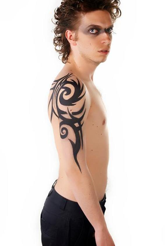 Племенные татуировки часто разрабатываются так, чтобы они намекали на основную форму. Эта татуировка использует большую черную область, чтобы представить форму посоха.