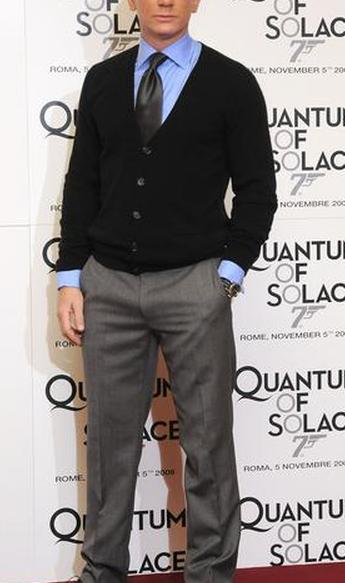 Дэниел Крейг представляет свое альтер-эго Джеймса Бонда в этом повседневном наряде. Не многим мужчинам удобно носить кардиганы, но этому британцу удобно. Ношение свитера вместо куртки — классический и крутой способ смягчить причудливость костюма.