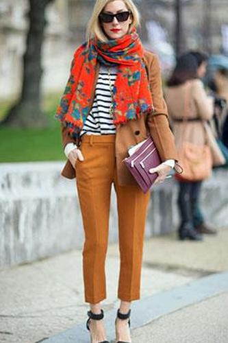 Теплые тона в ее наряде сочетаются с красными оттенками ее шарфа, а рубашка в черно-белую полоску придает образу легкости. Объемный шарф и блейзер слегка увеличенного размера контрастируют с узкими штанинами и зауженными брюками, создавая баланс в силуэте. Подберите узкие брюки в таких розничных магазинах, как J.Crew (их укороченные брюки в растянутом чиносе — новые брюки в этом силуэте) и блейзер оверсайз в разделе блейзеров ASOS — они предлагают огромное разнообразие стилей и по сходной цене. смотри, выбери те, на которых написано «бойфренд» или «большой размер».