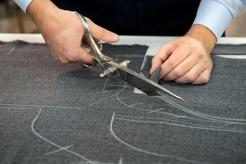 Когда разметка завершена, ткань разрезают традиционными портновскими ножницами. Когда все детали вырезаны, они передаются «триммеру», который наметит линии шва хлопчатобумажной нитью и обрежет подкладки и прокладки. Затем вырезанные детали сворачиваются в жгут, готовый для портного.