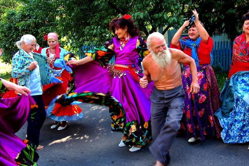 - Яркая юбка длиной до икры восточноевропейского рома в современном цветочном стиле; короткая крестьянская блузка с пышными рукавами и золотыми монетами на шее; и платок на голову; босиком или в туфлях на плоской подошве. (Находится в Болгарии, Румынии, Венгрии.)