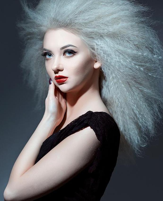 Если вы хотите сделать все возможное, начешите волосы, прежде чем использовать щипцы. Затем используйте свой любимый лак для волос сильной фиксации, чтобы получить желаемую форму. Еще лучше, если ваши волосы будут забавного оттенка, как этот платиновый блонд. Не скупитесь на красочный макияж.