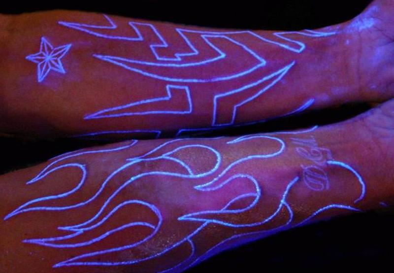 «Обычные» татуировки со светящимся контуром, чтобы подчеркнуть татуировку в ультрафиолетовом свете.