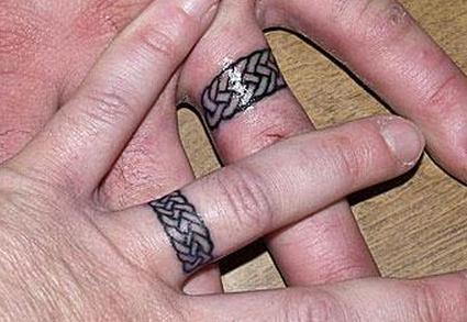 Пожалуй, самые известные татуировки с обручальными кольцами принадлежат Памеле Андерсон и Томми Ли. Памела сделала татуировку на безымянном пальце левой руки с надписью «Томми», а Томми сделал татуировку с надписью «Памела». Когда пара развелась, Памела сделала из чернил для кольца татуировку с надписью «Мамочка». Другие пары вскоре последовали примеру Памелы и Томми, и это можно рассматривать как начало взрывной популярности татуировок с обручальными кольцами. У комедийной актрисы Кэти Гриффин также была татуировка с обручальным кольцом, но она удалила ее с помощью лазера после того, как ее пятилетний брак распался.
