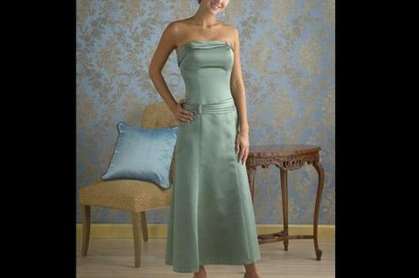 Потрясающий эффект солнечных лучей подчеркивает лиф без бретелек в форме сердца этого темно-синего шифонового платья чайной длины. За прозрачной юбкой скрывается более короткая непрозрачная нижняя юбка, что придает этому платью молодежный вид. Это платье отлично подходит для многих типов телосложения , но в нем есть ощущение молодости. Он поставляется в размерах от 2 до 26 и продается по цене около 120 долларов.