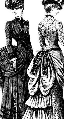 - Принцесса и пышные юбки: в 1860-х годах кринолины потеряли популярность, потому что популярный стиль юбки отличался более полной драпировкой сзади и прямым передом. Кроме того, цвета нижних юбок контрастировали с верхними, а юбки содержали множество украшений, таких как ленты и кружева. Юбочные шлейфы можно было увидеть не только на вечерних, но и на дневных платьях к началу 1870-х годов. Очень модной стала юбка-бюст, своим большим объемом сзади переходящая в прямую драпировку.