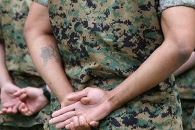 Политика морских пехотинцев в отношении татуировок не разрешает татуировки на голове, руках, шее или любой другой части тела, которая видна, когда морской пехотинец одет в униформу, а татуировки на рукавах считаются чрезмерными. Нынешним морским пехотинцам, у которых есть татуировки, нарушающие эти ограничения, может быть разрешено сохранить свои татуировки; однако эти татуировки могут помешать морским пехотинцам продвинуться в профессиональном плане и помешать им повторно поступить на военную службу.