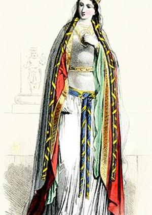 Женщины в Испании не носили сложных головных уборов до конца 14 века. Они носили платки среднего размера, а волосы были распущены. Они также носили нить жемчуга, венок или рулон ткани вокруг распущенных распущенных волос.