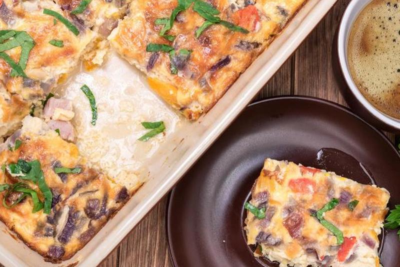 Если вы следите за потреблением углеводов или соблюдаете палеодиету, подавать на завтрак запеканки с картофелем или печеньем запрещено. Но запеканка из запеченной цветной капусты и яиц с низким содержанием углеводов — нет. Он содержит смесь чеддера и швейцарских сыров и чесночного порошка. Чтобы блюдо получилось более сытным, добавьте нарезанную кубиками ветчину или бекон. Запеканка запекается примерно за 40 минут.