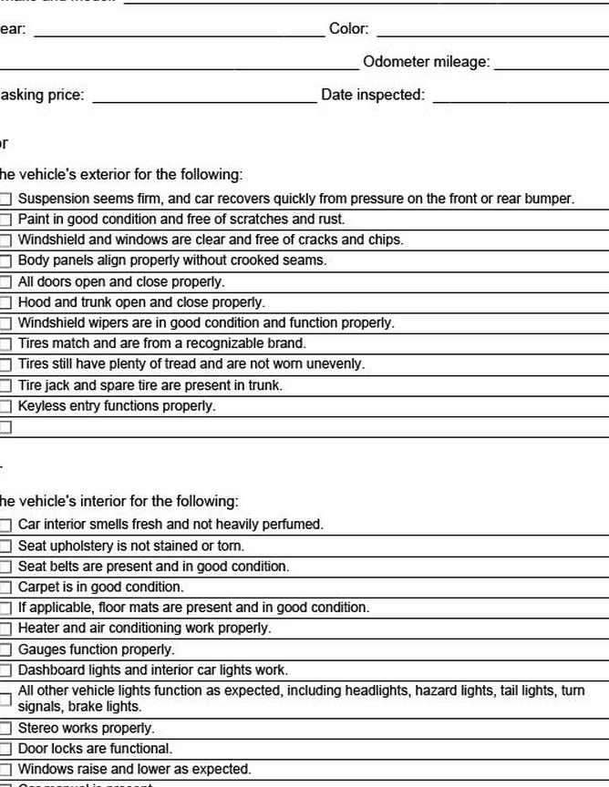 Если вы подумываете о покупке подержанного автомобиля, при осмотре автомобиля может оказаться полезным использовать форму осмотра автомобиля. Эта бесплатная распечатка помогает убедиться, что все системы находятся в рабочем состоянии, и что вы получите хорошие скидки на свой подержанный автомобиль. Используйте его, чтобы изучить потенциальную покупку, прежде чем делать предложение продавцу.