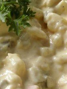 - Курица с белым соусом, приправленная обжаренными грибами и луком, посыпанная свежим тимьяном