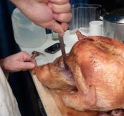 После соответствующего кипячения процедите бульон через марлю, стараясь выжать из ингредиентов последний кусочек аромата. Затем поместите процеженный бульон в 3-литровую кастрюлю. Вы можете добавить дополнительно нарезанную петрушку и тимьян для более ароматного соуса. Пока индейка готовится, вы должны полить ее водой или готовым бульоном, чтобы запечатать сок. Капает формирует последний ингредиент вашего соуса из индейки. Когда индейка будет готова, достаньте ее из духовки и положите на решетку. Процедите капли из жаровни и добавьте их в бульонную основу.