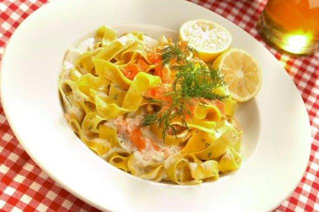 - Поместите пенне в большую сервировочную миску. Лосось измельчить на небольшие кусочки и добавить в пенне с овощами.
