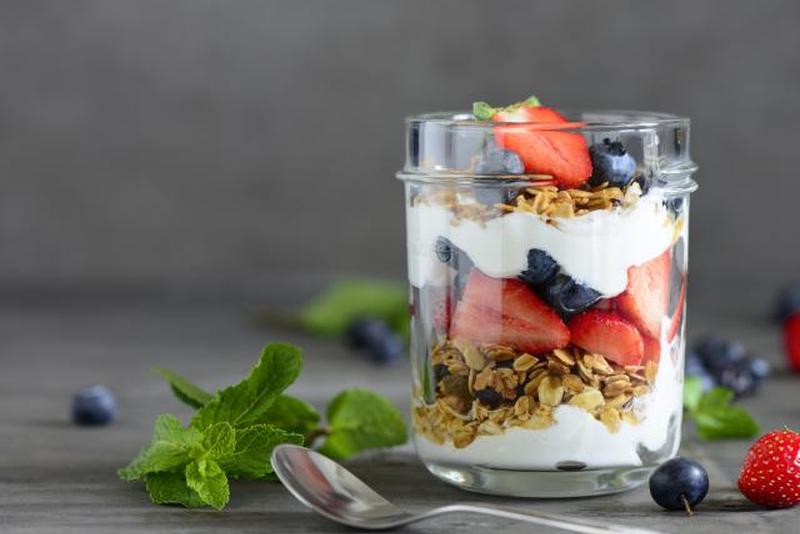 1. Парфе из греческого йогурта и чашка с фруктами.