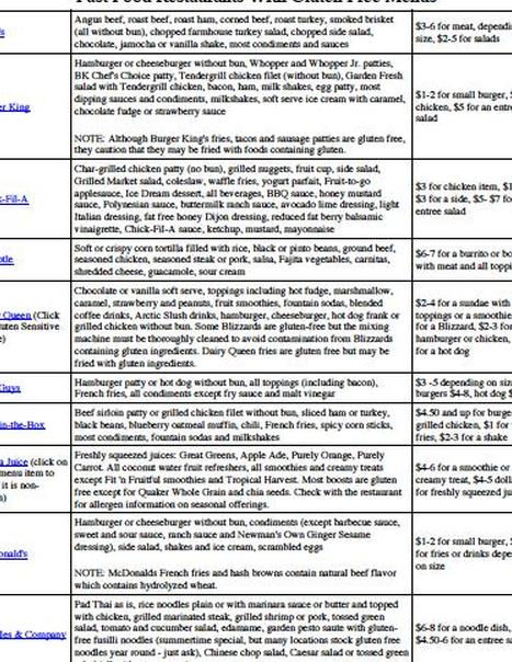 Варианты выше представляют рестораны быстрого питания с лучшими безглютеновыми блюдами. В то время как некоторые сети определяют свой картофель фри как не содержащий никаких ингредиентов глютена, почти все сети готовят картофель фри на том же масле, что и продукты, содержащие глютен, такие как куриные котлеты в панировке. Этот тип перекрестного загрязнения означает, что картофель фри не может считаться безопасным для тех, кто придерживается безглютеновой диеты.
