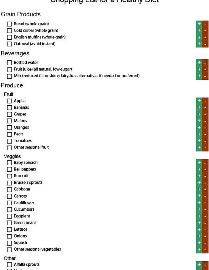 Потребление сбалансированной диеты , которая включает в себя продукты из всех групп продуктов питания является самым здоровым вариантом для взрослых и детей. Включение разнообразных фруктов, овощей, цельнозерновых продуктов , нежирных белков и полезных жиров в свой распорядок дня — лучший способ получить необходимые питательные вещества, а также контролировать потребление калорий. Использование списка покупок, который включает в себя выбор здоровой пищи, такой как представленный здесь для печати, — отличный способ начать делать правильный выбор продуктов питания.