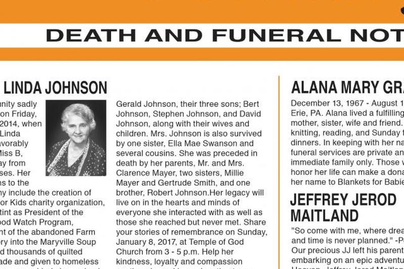 К сожалению, в пятницу, 6 января 2014 года, наше сообщество потеряло один из столпов, когда миссис Бетси Линда Джонсон, известная как мисс Б., скончалась естественной смертью. Ее вклад в жизнь многих включает создание благотворительной организации «Рождество для детей», 20-летнее пребывание в должности президента программы Neighborhood Watch, превращение заброшенной фабрики на Фарм-стрит в ресторан Maryville Soup Kitchen, а также изготовление тысяч стеганых одеял и подарен бездомным ветеранам в нашей области.