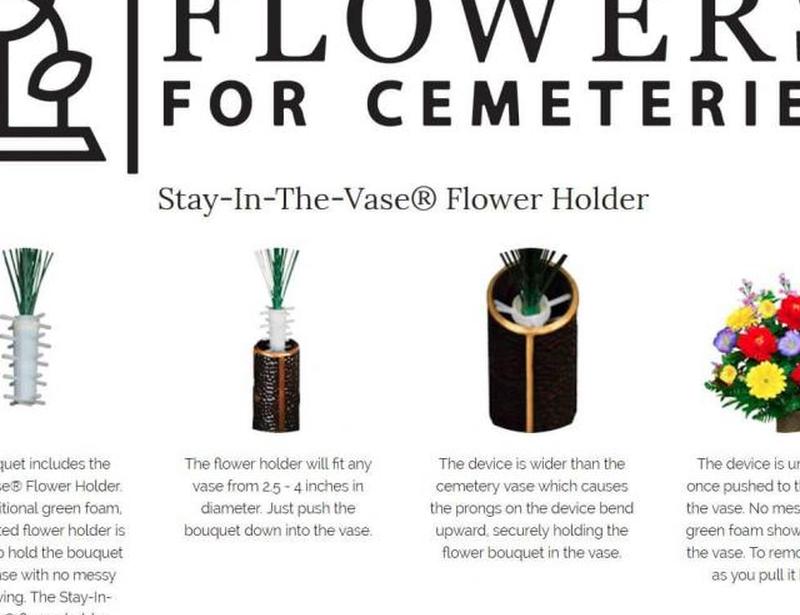 Изделие Stay-In-The-Vase® представляет собой дизайн подставки для цветов. Держатель предназначен для большинства кладбищенских ваз диаметром от 2,5 до 3,5 дюймов.