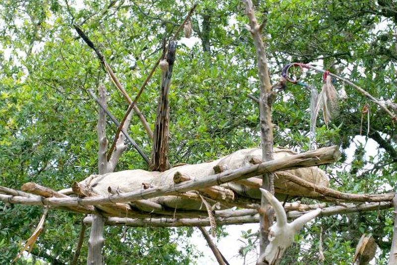 Традиционно сиу помещали тело умершего на дерево или на платформу помоста, которая стояла на высоте около восьми футов над землей, и останки оставались там в течение одного года. С телом обращались так, как будто в нем еще была жизнь. Человек был одет в его или ее лучшую одежду и зашит шкурой животного. Этот узел был помещен на эшафот вместе с вещами и продуктами умершего. Через год тело было закопано в землю.