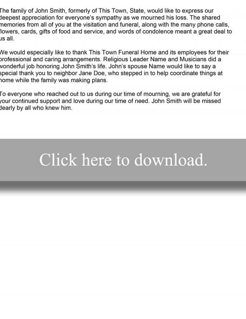 Загрузите этот шаблон подтверждения Руководство по Adobe Printables . Его можно персонализировать и использовать в качестве благодарности к похоронам в газете или на веб-сайте или в качестве образца благодарственной речи с небольшими изменениями.