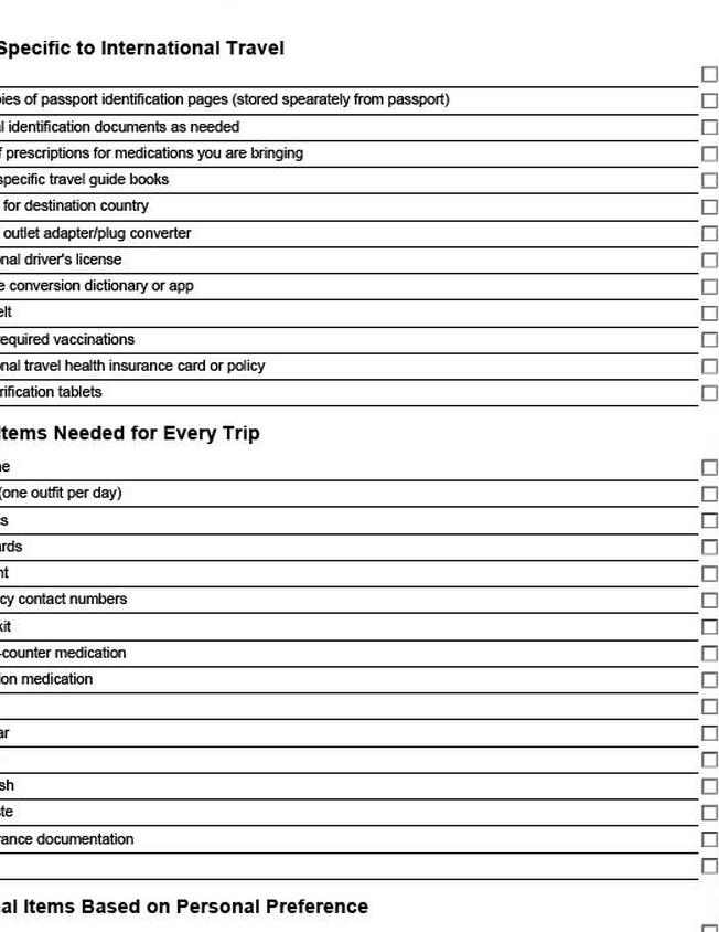 Попытка полагаться на память при подготовке к международной поездке может внести ненужное беспокойство в ситуацию, которая сама по себе достаточно напряженна. Если вы готовитесь к путешествию, не совершайте ошибку, пытаясь отслеживать важную задачу по сбору вещей только по памяти. Вместо этого загрузите и настройте бесплатный печатный список вещей для поездки, представленный здесь, чтобы вы могли оставаться организованным и быть уверенным, что у вас есть все, что вам нужно.
