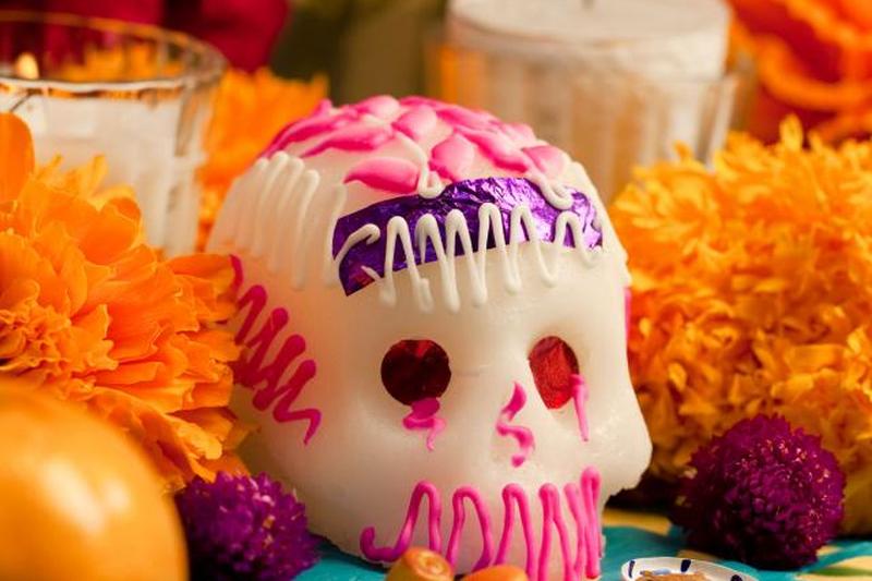 Добавьте отдельные свечи (от пяти до семи на длинный стол), яркие цветочные букеты из настоящих или искусственных цветов и нарисованные пластиковые черепа между тарелками, чтобы погрузить стол в дух Дня мертвых.