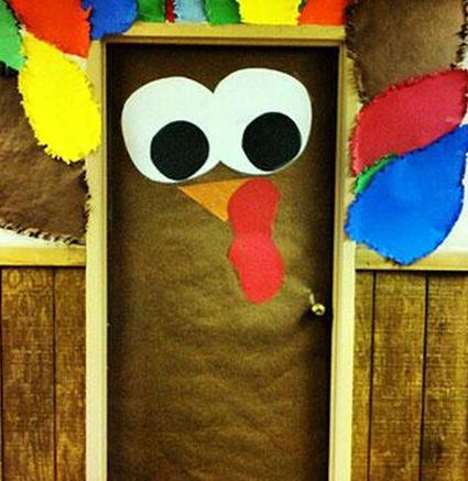 - Начните с великолепного украшения двери с изображением индейки или праздничной доски объявлений с культовыми персонажами Дня Благодарения.