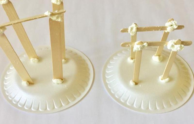 - Поместите одну из строительных конструкций между книгами (начните со здания из 2-сантиметровых палочек).