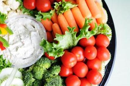 Еще одним фаворитом является овощной лоток. Выложите морковь, сельдерей, брокколи, цветную капусту, огурцы, красный и зеленый болгарский перец и помидоры черри на большой поднос.