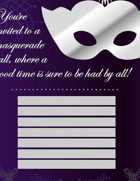 Первый шаблон в верхней части страницы предназначен для частного бала, а шаблон ниже разработан специально для благотворительного бала-маскарада. Для достижения наилучших результатов запланируйте печать приглашений на карточках или плотной бумаге.