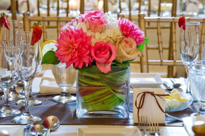 Добавьте интерес к центральному украшению из свежих цветов, подарив их в уникальной вазе. Например, эта прямоугольная ваза привлекает внимание к бутонам роз, скрывая стебли, а также придает столу современный угловатый вид.