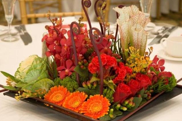 Цветочные композиции — традиционное украшение званого обеда. Вместо того, чтобы придерживаться традиционных букетов в прозрачных стеклянных вазах или корзинах, выберите центральный элемент с особым элементом. Составьте уникальную композицию, например, используйте тропические цветы, необычный горшок или вазу или неожиданные цветы.