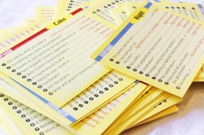 Если у вас неплохая память и дар болтливости, вы очень хорошо сыграете в Buzzword. Для начала игроки должны сформировать две команды. Во время хода каждой команды вытягивается карта, содержащая «Модное слово» и 10 подсказок. Ответ на каждую подсказку должен включать «модное слово». Например, если «модное слово» — «яблоко», а первая подсказка — «объект моей привязанности», ответ будет «яблоко моего ока». Если «Модное слово» — это «мяч», подсказки и ответы будут следующими: