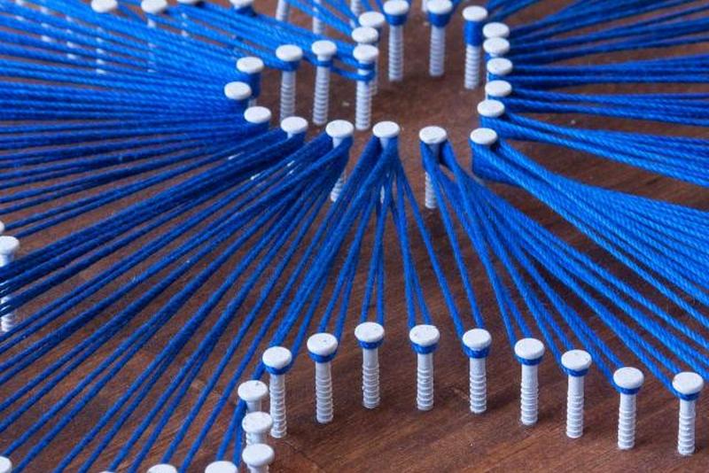 Струнное искусство придает живость ремеслу, смешивая фурнитуру, такую как гвозди и дерево, с тонко натянутой нитью и пряжей. Вы можете менять местами цвета и методы в зависимости от ваших предпочтений, чтобы создавать новые произведения искусства из того же рисунка.