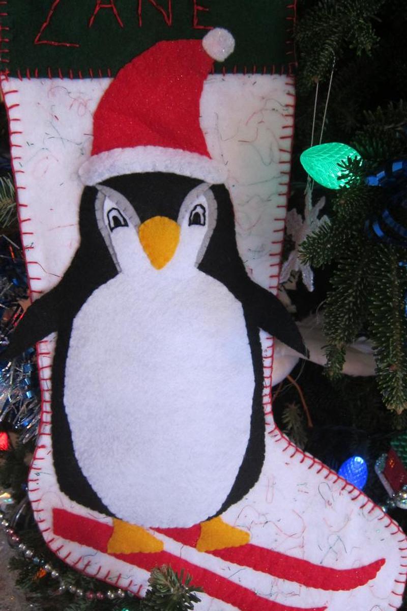- Если вы будете персонализировать чулок, выделите несколько минут, чтобы вышить имя человека на манжете. Также вышейте глазки пингвину черной мулине.