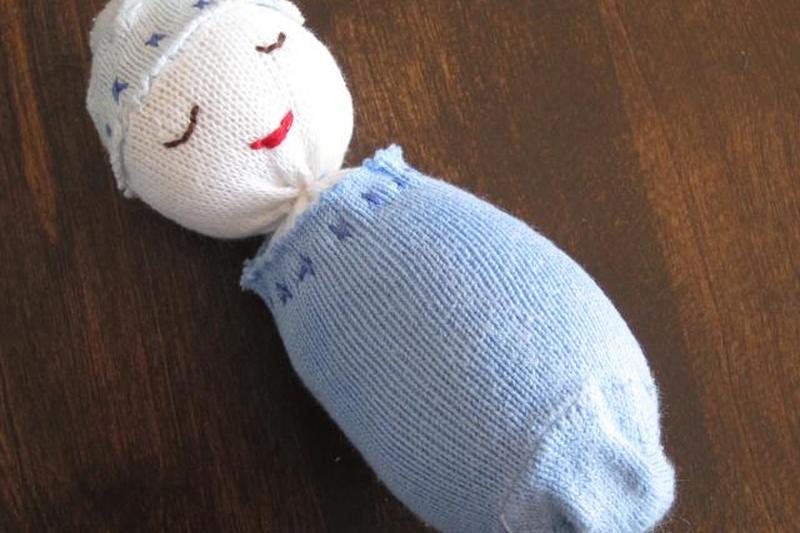 Отрежьте носок другого цвета у носка, чтобы сделать шапочку для ребенка. Наденьте его на головку погремушки, но пока не пришивайте. Вместо этого используйте его, чтобы скрыть узлы при шитье лица. Используйте коричневую нить для вышивания глаз и красную для рта. Затем потяните шляпу вниз, чтобы скрыть узлы, и используйте подходящую нить, чтобы надежно пришить ее к голове. Готово!