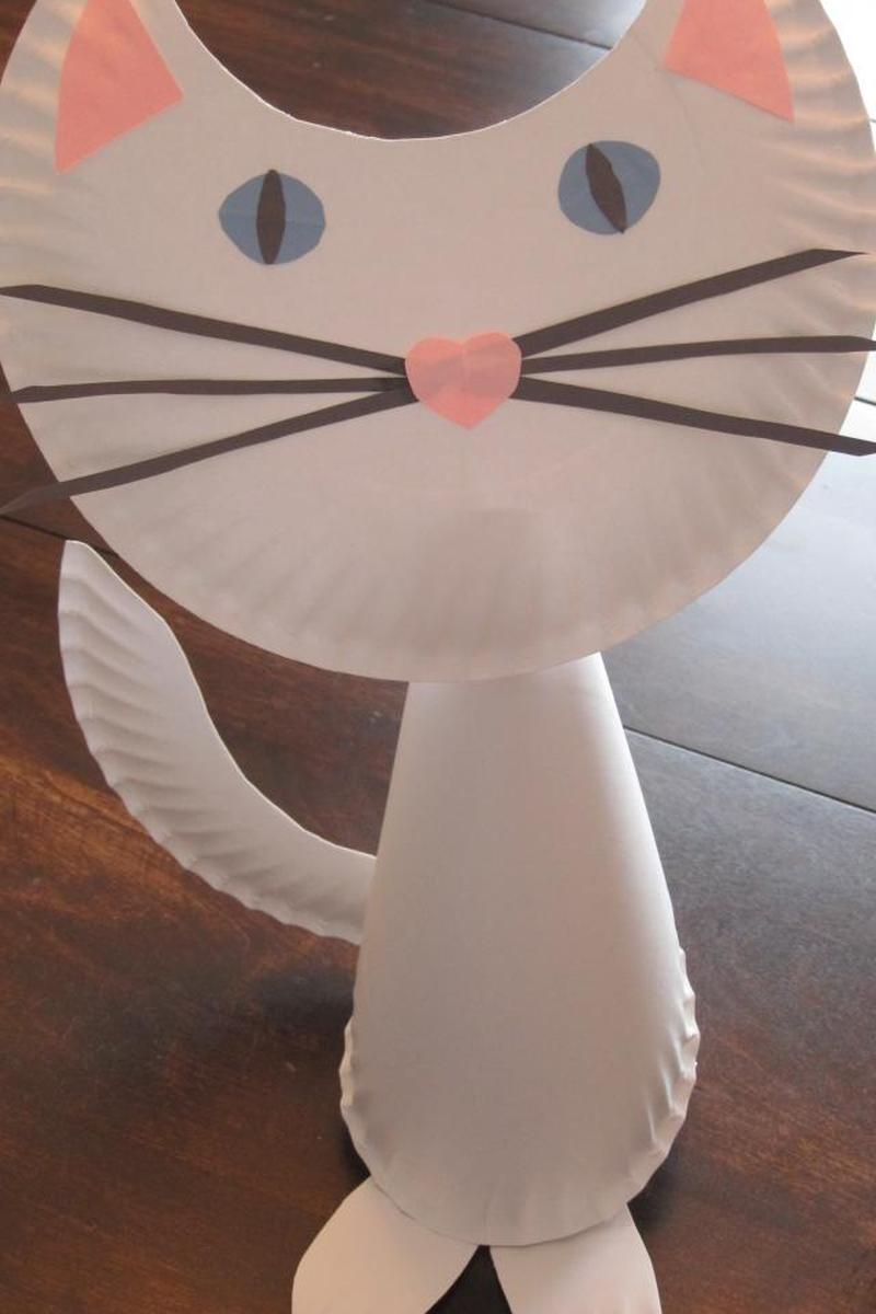 Из бумажных тарелок поменьше сделайте котенка.