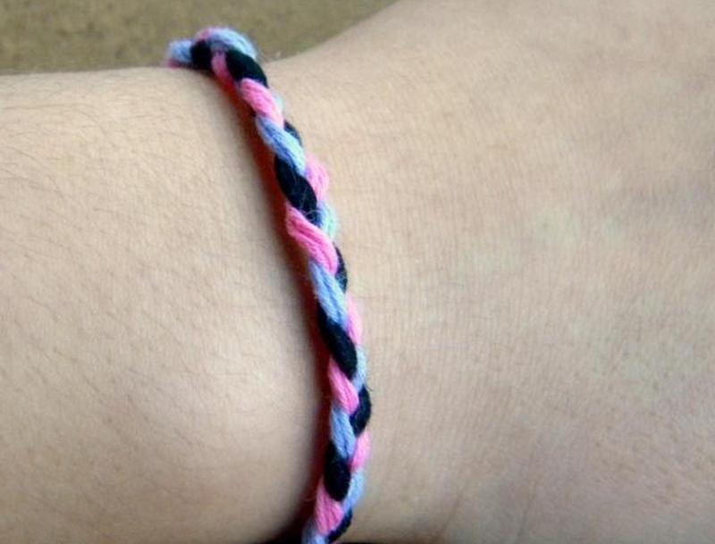 - Когда коса станет достаточно длинной, чтобы обернуть ее вокруг запястья вашего друга, протяните свободные концы через петлю и завяжите их, чтобы закрепить. Ваш простой браслет дружбы готов!